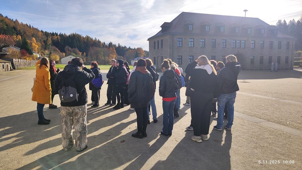 Ve středu 5.11. 2025 se uskutečnila odborná exkurze pro 1. a 2. ročník vyšší odborné školy do památníku koncentračního tábora Flossenbürg v bavorském příhraničí. Průvodci seznámili studenty s historií koncentračního tábora a připomněli některé významné události 2. světové války. V koncentračním táboře byli vězněni i čeští občané a jejich osudy byly součástí informačních tabulí prohlídkového okruhu. Studenti rovněž navštívili nedalekou zříceninu hradu Flossenbürg. Exkurze přímo navazuje na předmět Mezinárodní vztahy. Měli jsme štěstí, protože jsme měli letos mimořádně pěkné počasí. Pedagogický doprovod tvořili PhDr. Václav Beran a Mgr. Josef Grosser.